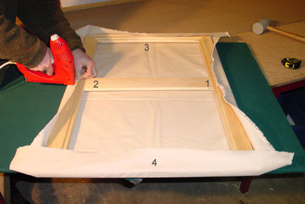 ii. Start by stapling the canvas in the centre of each bar (steps 1, 2, 3, 4). Pull canvas tight using canvas pliers, or by hand and staple in place.