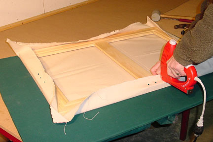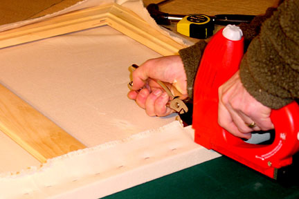 iii.Working again on all four sides as above (steps 1, 2, 3, 4), drive 3 more staples about 1.5 inches apart on each side of the first staple, applying tension to the canvas while stapling.
