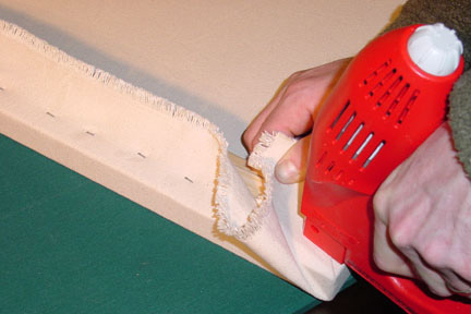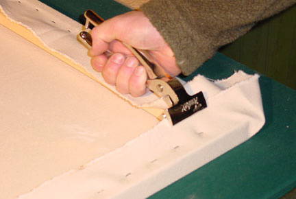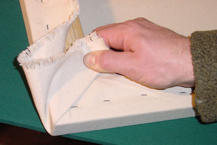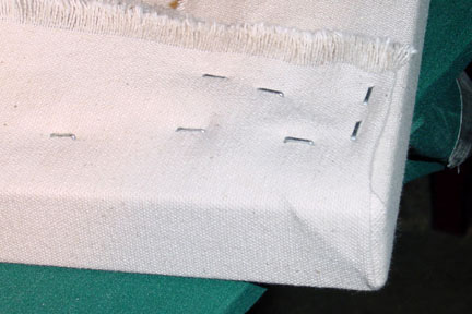vi. Staple the other side right to the end and pull the corner of the canvas in……..